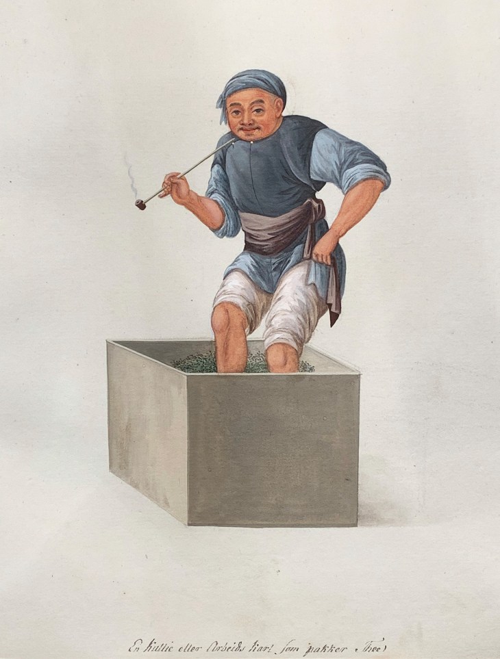 1700-tallets verdenshandel har efterladt sig det ene fabelagtige motiv efter det andet, og mange har endda ikke været vist i utallige år. Her er fx en kinesisk arbejdskarl, der nyder en pibe tobak (opium?), mens han pakker te i en af tekisterne, der skal sælges på auktion i København. Tekisterne blev foret med bly for at holde fugt og lugt ude. Gad vide om tenyderne i Danmark og Norge i 1700-tallet tænkte over, hvor meget fodsved og bly, der gemte sig i koppen med den liflige drik?
