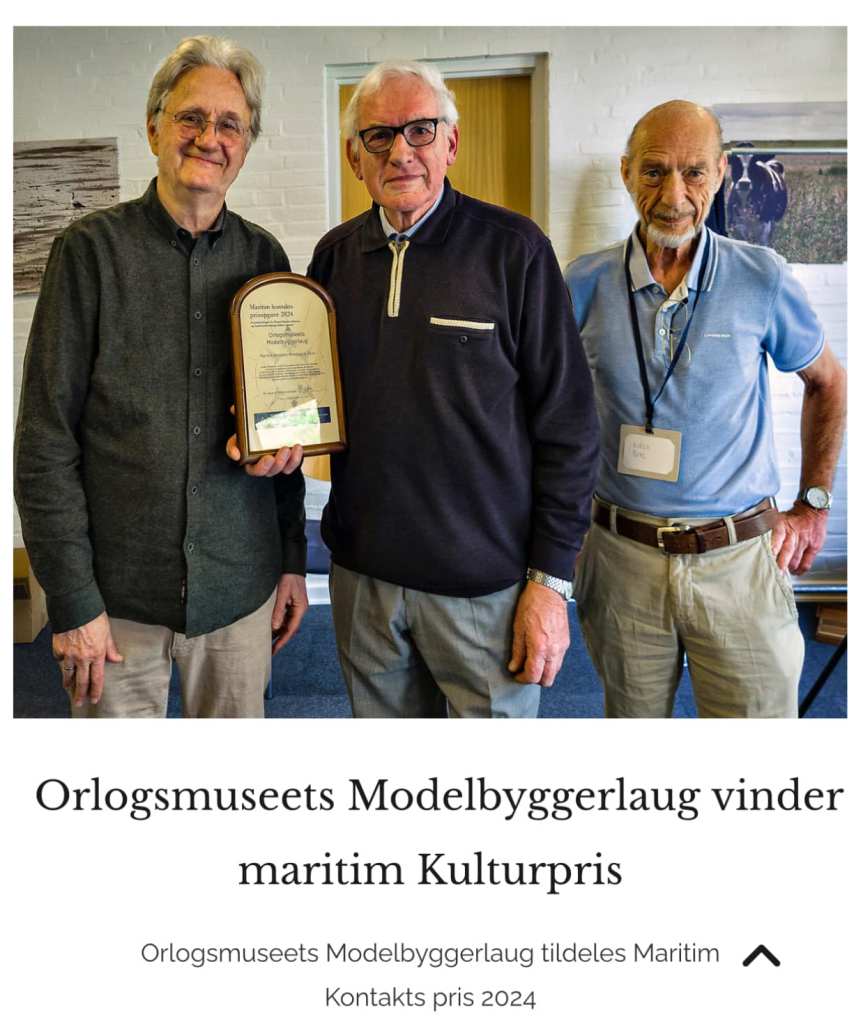 Det er med stor glæde, at Kontaktudvalget for Dansk Maritim Historie- og Samfundsforskning ved Maritimhistorisk Konference 2024 i Ribe kunne tildele Maritim Kontakts Pris til Orlogsmuseets Modelbyggerlaug med begrundelsen: “Orlogsmuseets Modelbyggerlaug har gennem flere årtier arbejdet minutiøst og dedikeret med at genskabe den fysiske maritimhistoriske kulturarv i miniformat – i en grad så modellerne i sig selv er blevet kulturarv. Modelbyggerne i lauget er både dygtige hver især, og samtidig udnytter de i deres store fælles projekter de enkelte medlemmers spidskompetencer.”